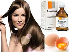 Маска с димексидом и маслами. Состав: 1 чайная ложка персикового масла, 1 чайная ложка любого растительного масла (касторового, репейного, миндального, кокосового), 1 желток, 1 чайная ложка раствора “Димексида”. Для жирных волос рекомендуется добавить в маску 1 ст. ложку коньяка. Все тщательно перемешать. Нанести маску сначала на корни волос, затем распределить по всей длине. Накрыть голову полиэтиленом, утеплить полотенцем. Через полчаса смыть маску шампунем, тщательно ополоснуть водой, желательно с добавлением сока лимона.