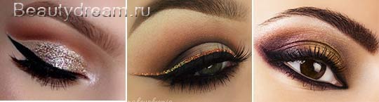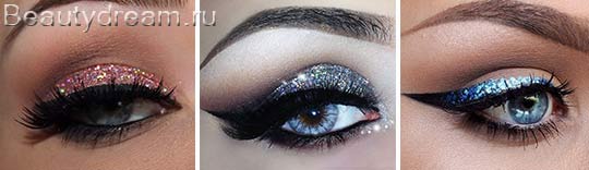 Цветные стрелки, нанесенные глиттером, будут уместны в новогоднюю ночь не только для юных девушек, но и в бальзаковском возрасте. Цвет стрелок подберите под тон платья, обведите контур глаз черной подводкой, плюс густо подкрашенные реснички - и образ готов.