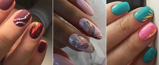 Ногти будут выглядеть интересно, если покрыть их однотонным гель-лаком, а сверху выложить разноцветные кусочки фольги или целлофана.